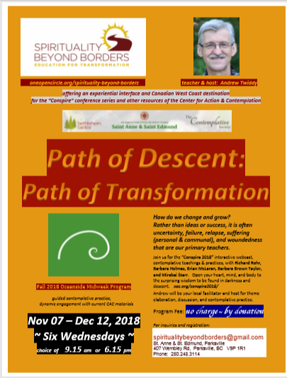Join us for the "Conspire 2018" interactive web cast, contemplative teachings & practises, with Richard Rohr, Barbara Holmes, Brian McLaren, Barbara Brown Taylor, and Mirabai Starr. Open your heart, mind and body to the surprising wisdom to be found in darkness and descent. cac.org/conspire 2018/